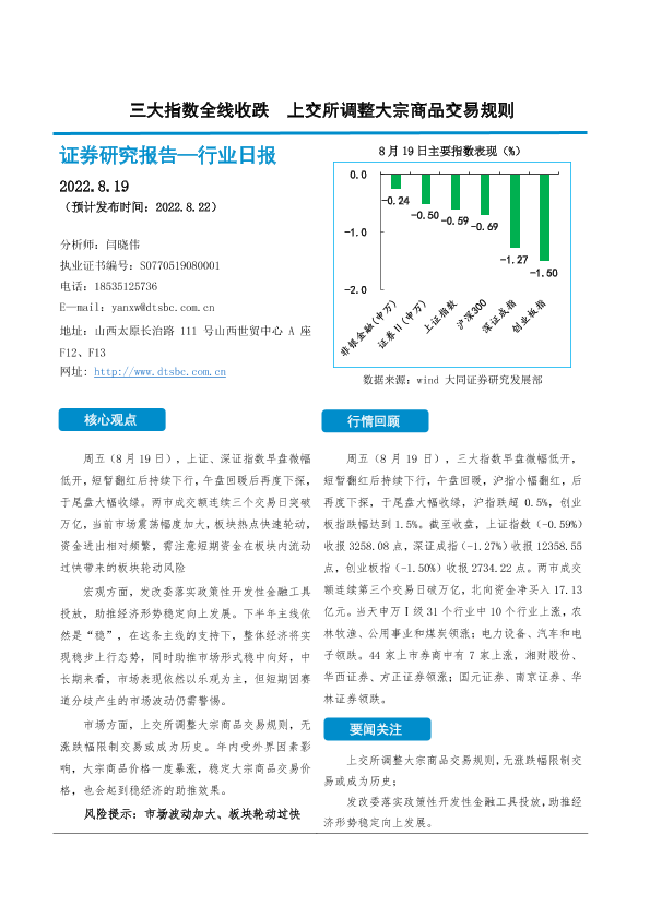 【大同证券】【20220819】证券行业日报:三大指数全线收跌 上交所调整大宗商品交易规则-10页