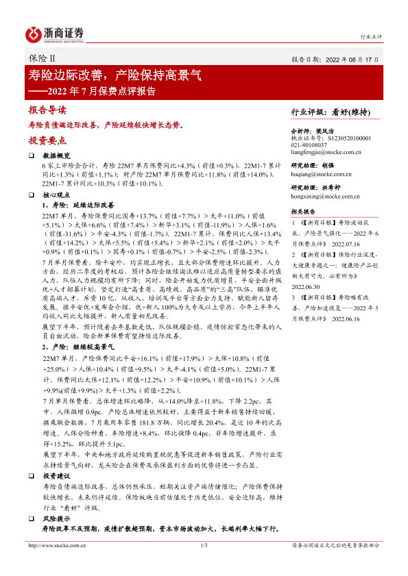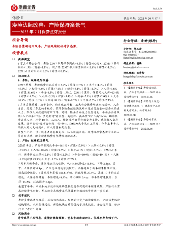 【浙商证券】【20220817】2022年7月保费点评报告:寿险边际改善,产险保持高景气-3页
