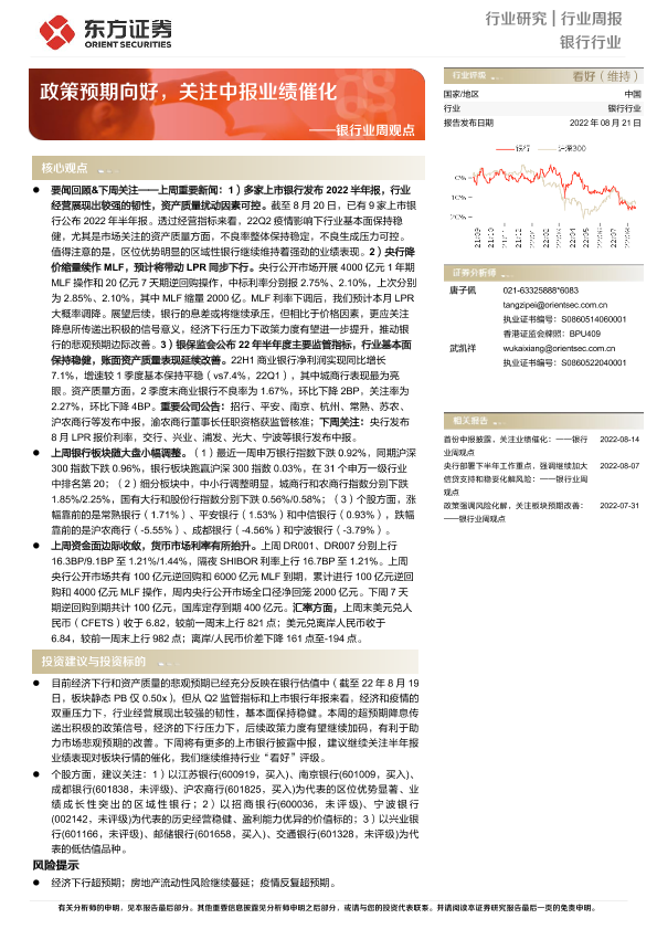 【东方证券】【20220821】银行业周观点:政策预期向好,关注中报业绩催化-17页