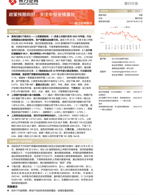 MLF利率 中报业绩 政策预期 资产质量 银行业