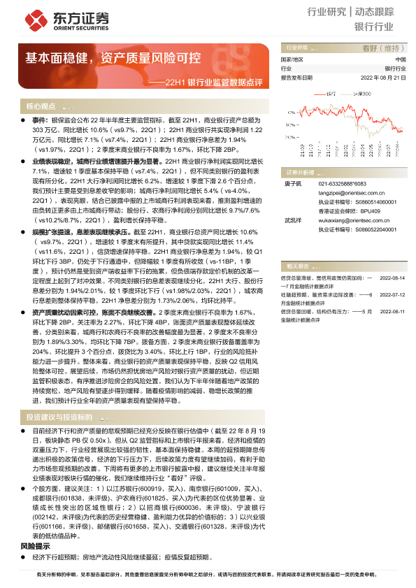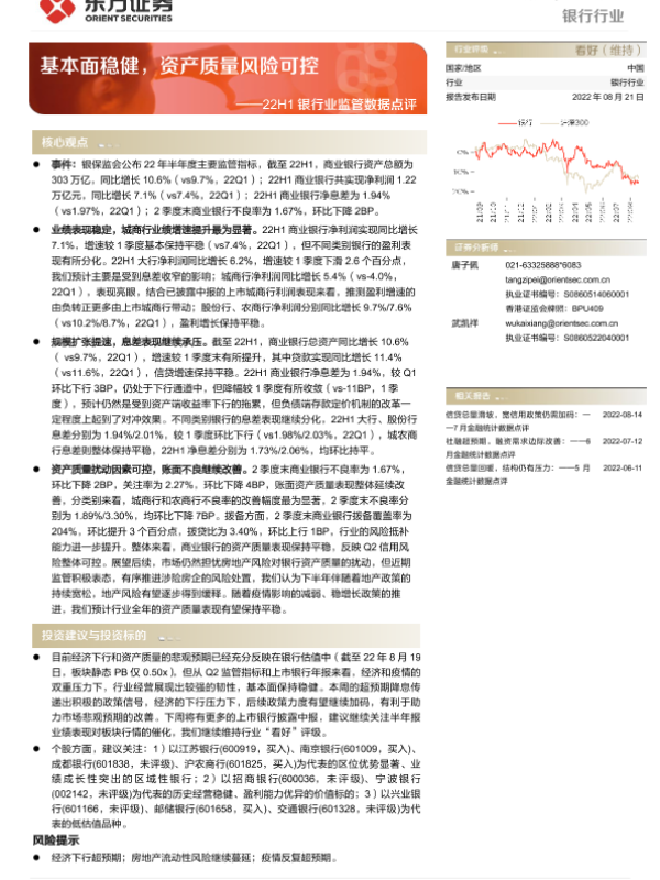 【东方证券】【20220821】22H1银行业监管数据点评:基本面稳健,资产质量风险可控-4页
