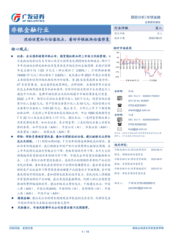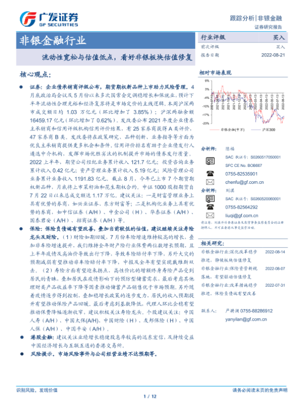 【广发证券】【20220821】非银金融行业:流动性宽松与估值低点,看好非银板块估值修复-12页