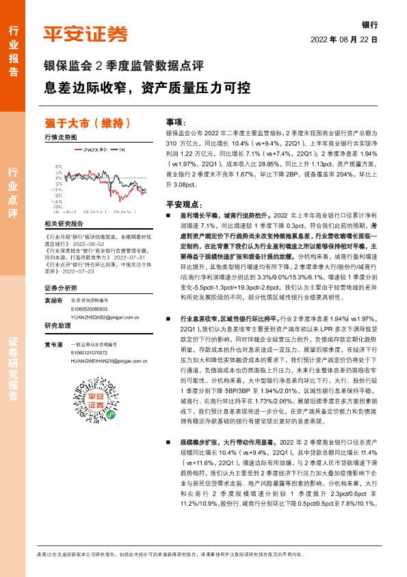 【平安证券】【20220822】银保监会2季度监管数据点评:息差边际收窄,资产质量压力可控-4页