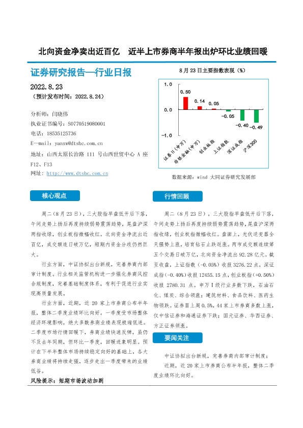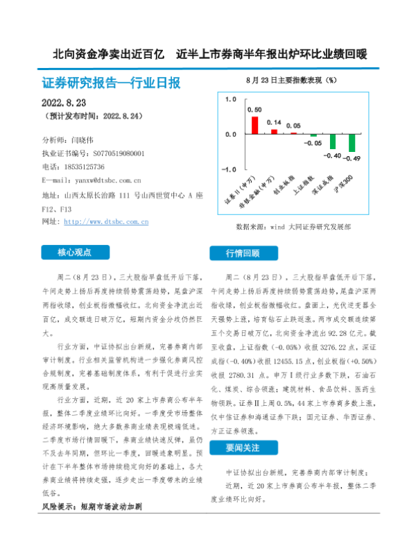 【大同证券】【20220823】北向资金净卖出近百亿 近半上市券商半年报出炉环比业绩回暖-11页