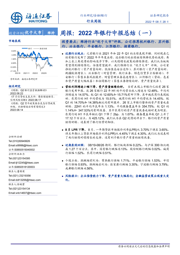 2022年中报 LPR调整 业绩分析 资产质量 银行周报