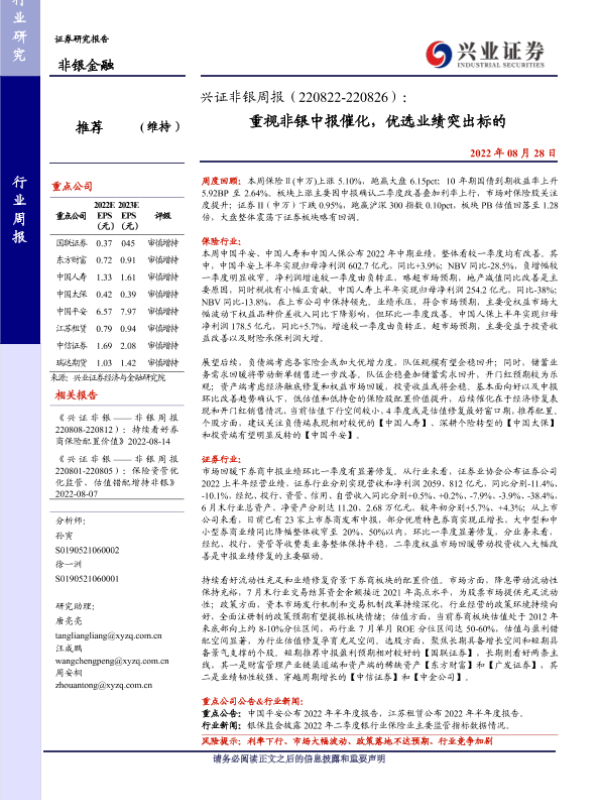 业绩预测 中报分析 保险股 券商 非银金融