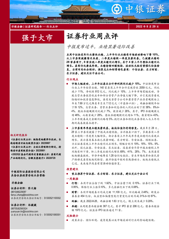 【中银证券】【20220829】证券行业周点评:中报发布过半,业绩显著边际改善-9页