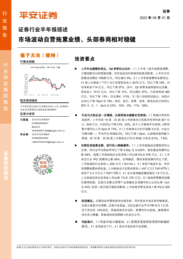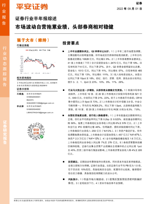 【平安证券】【20220901】证券行业半年报综述:市场波动自营拖累业绩,头部券商相对稳健-13页