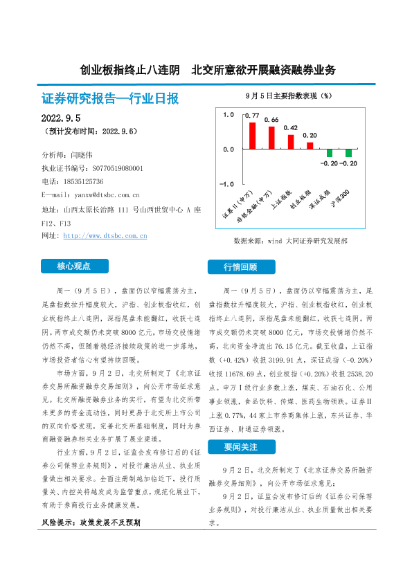 【大同证券】【20220905】非银金融行业日报:创业板指终止八连阴 北交所意欲开展融资融券业务-10页