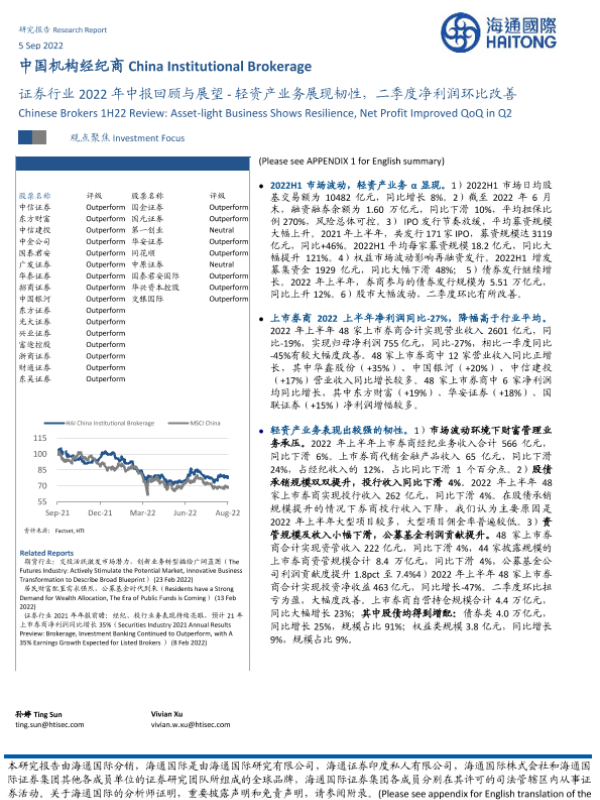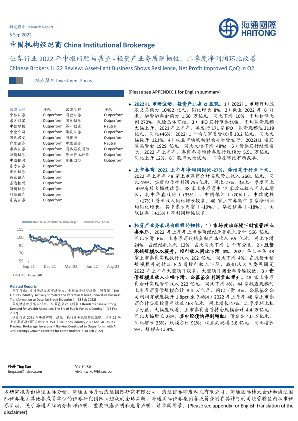 【海通国际】【20220905】证券行业2022年中报回顾与展望:轻资产业务展现韧性,二季度净利润环比改善-32页