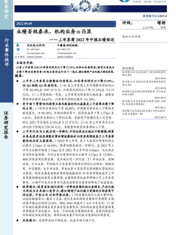 【国泰君安证券】【20220905】上市券商2022年中报业绩综述:业绩否极泰来,机构业务α凸显-12页