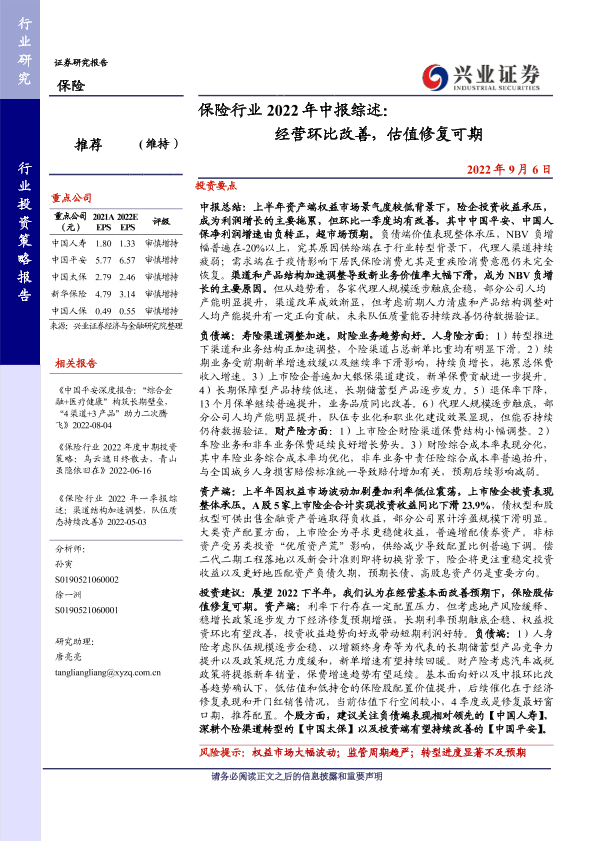 【兴业证券】【20220906】保险行业2022年中报综述:经营环比改善,估值修复可期-29页
