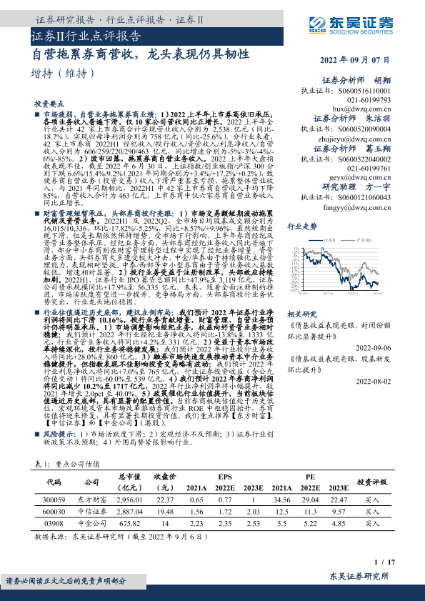 【东吴证券】【20220907】证券Ⅱ行业点评报告:自营拖累券商营收,龙头表现仍具韧性-17页