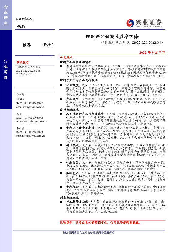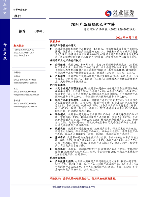 【兴业证券】【20220907】银行理财产品周报:理财产品预期收益率下降-19页