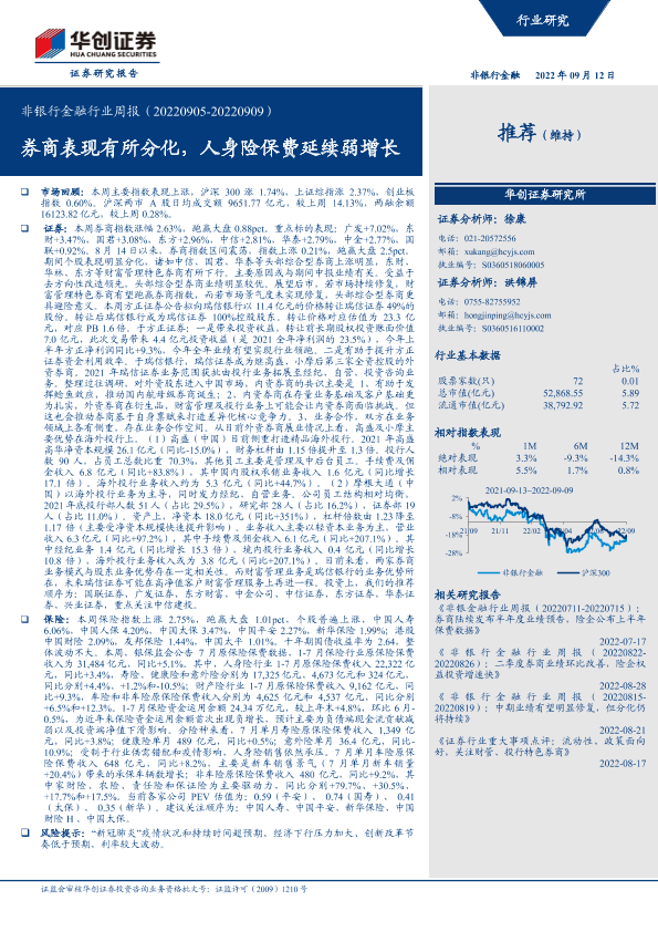 【华创证券】【20220912】非银行金融行业周报:券商表现有所分化,人身险保费延续弱增长-18页