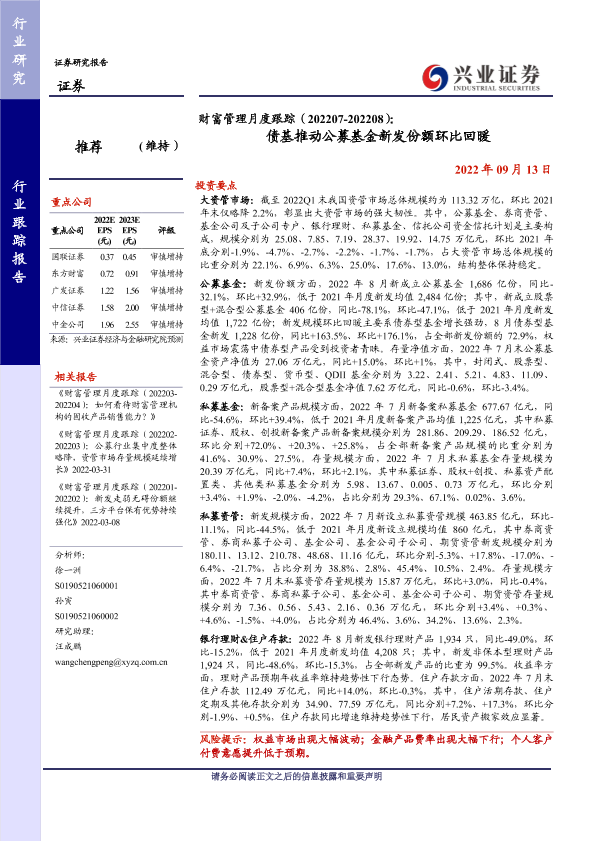 【兴业证券】【20220913】证券行业:财富管理月度跟踪-债基推动公募基金新发份额环比回暖-12页