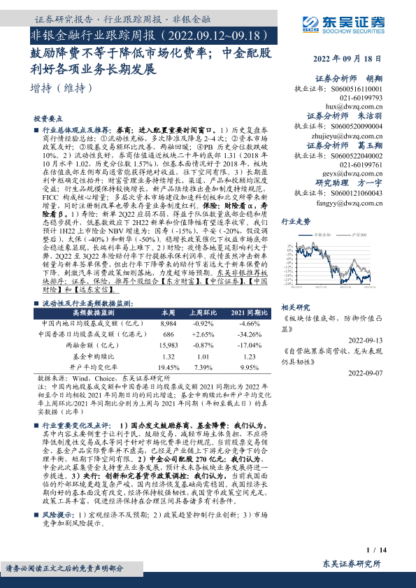 【东吴证券】【20220918】非银金融行业跟踪周报:鼓励降费不等于降低市场化费率;中金配股利好各项业务长期发展-14页