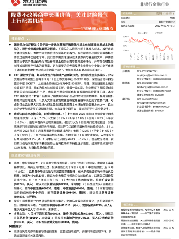 【东方证券】【20220919】非银金融行业周观点:降费不改券商中长期价值,关注财险景气上行配置机遇-13页