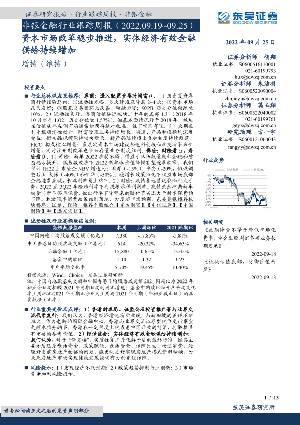 【东吴证券】【20220925】非银金融行业跟踪周报:资本市场改革稳步推进,实体经济有效金融供给持续增加-13页