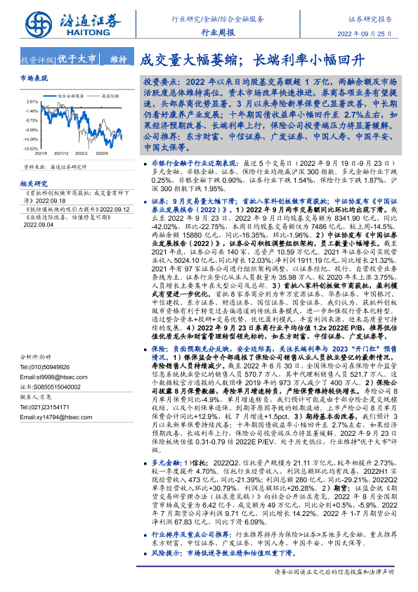 【海通证券】【20220925】综合金融服务行业周报:成交量大幅萎缩;长端利率小幅回升-10页