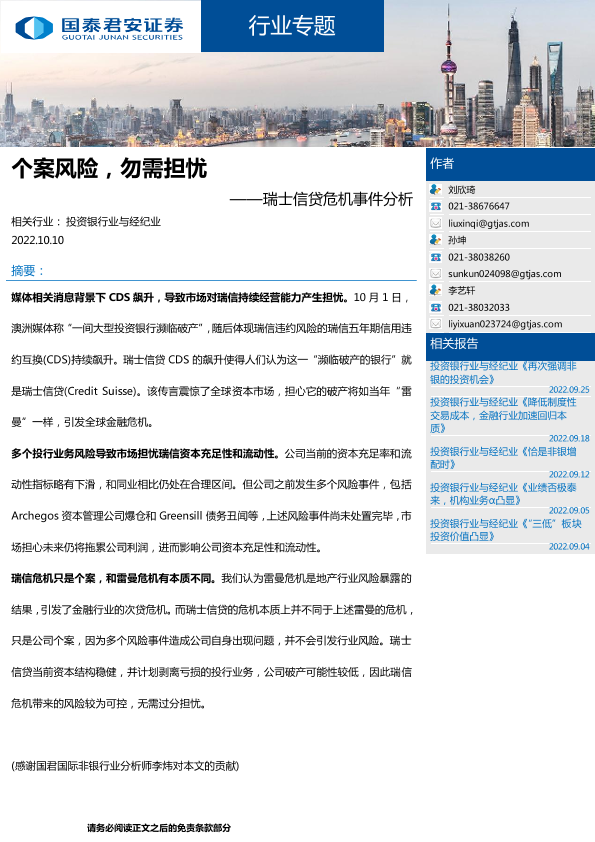 【国泰君安证券】【20221010】个案风险,勿需担忧——瑞士信贷危机事件分析-15页