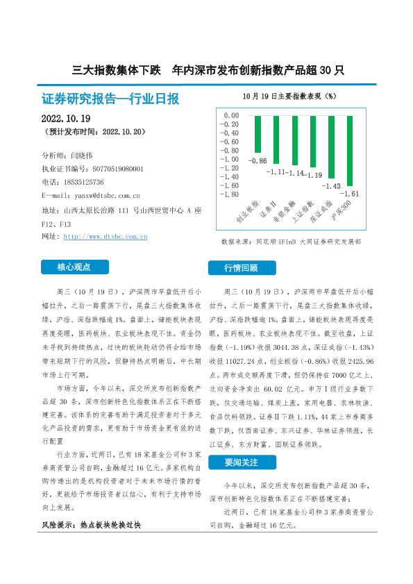 【大同证券】【20221019】非银金融行业日报:三大指数集体下跌 年内深市发布创新指数产品超30只-10页