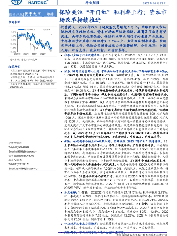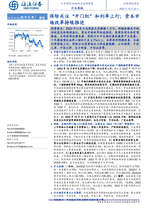 【海通证券】【20221023】综合金融服务行业周报:保险关注“开门红”和利率上行;资本市场改革持续推进-11页