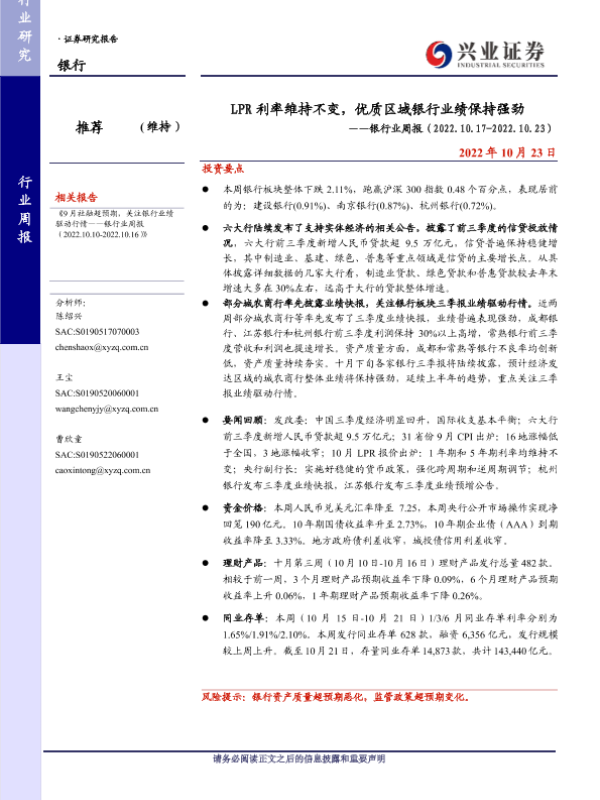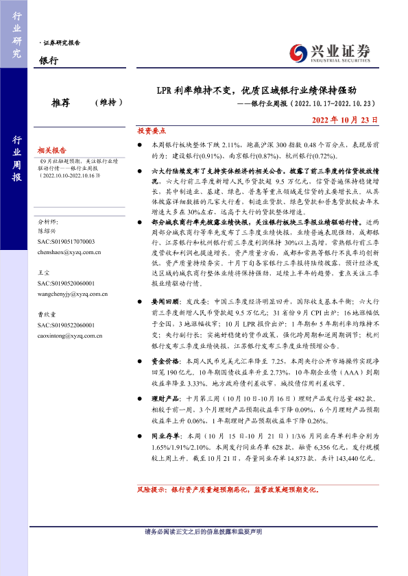 【兴业证券】【20221023】LPR利率维持不变,优质区域银行业绩保持强劲-15页