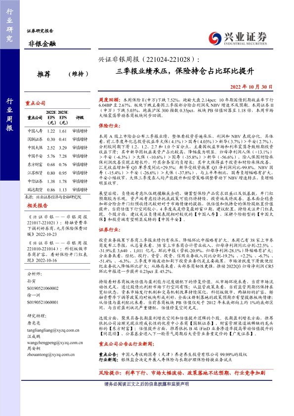 【兴业证券】【20221030】兴证非银周报:三季报业绩承压,保险持仓占比环比提升-15页
