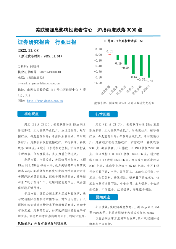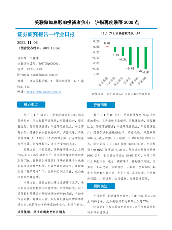 【大同证券】【20221103】非银金融行业日报:美联储加息影响投资者信心 沪指再度跌落3000点-10页
