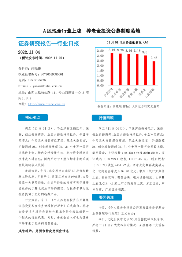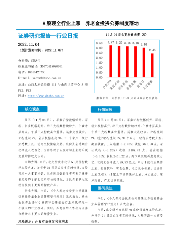 【大同证券】【20221104】非银金融行业日报:A股现全行业上涨 养老金投资公募制度落地-10页