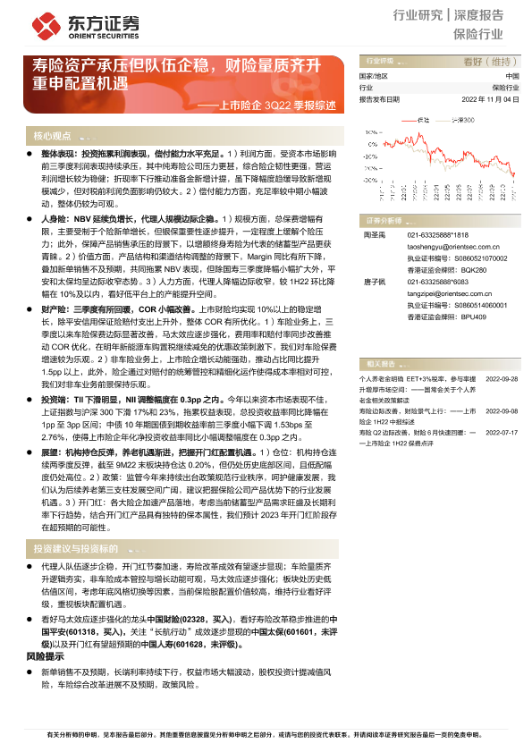 【东方证券】【20221104】上市险企3Q22季报综述:寿险资产承压但队伍企稳,财险量质齐升重申配置机遇-21页