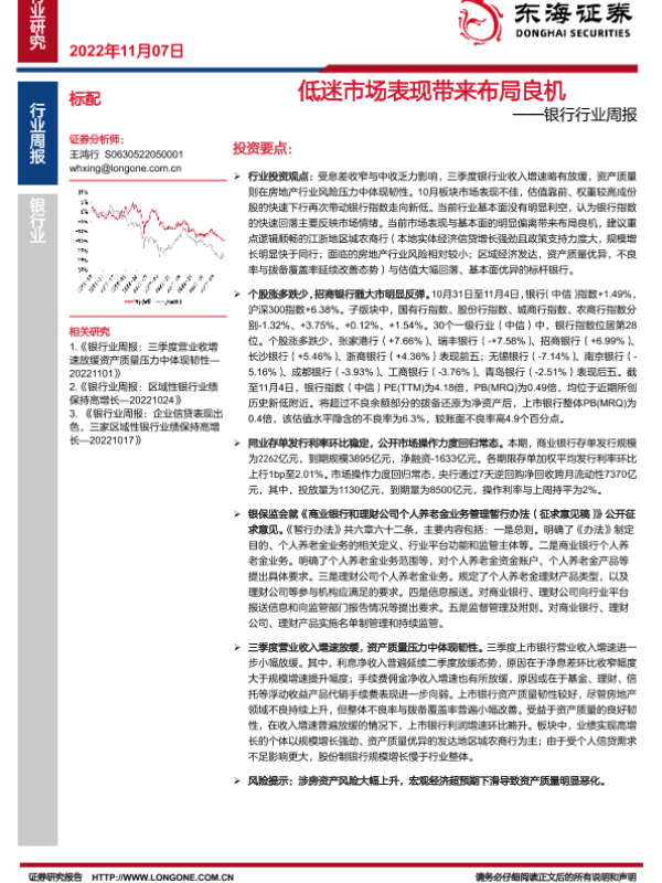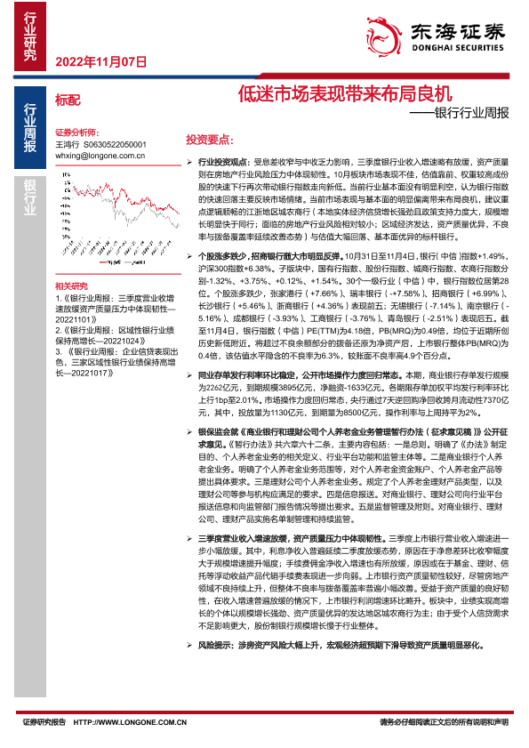 【东海证券】【20221107】银行行业周报:低迷市场表现带来布局良机-12页