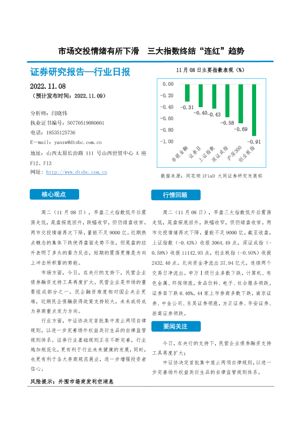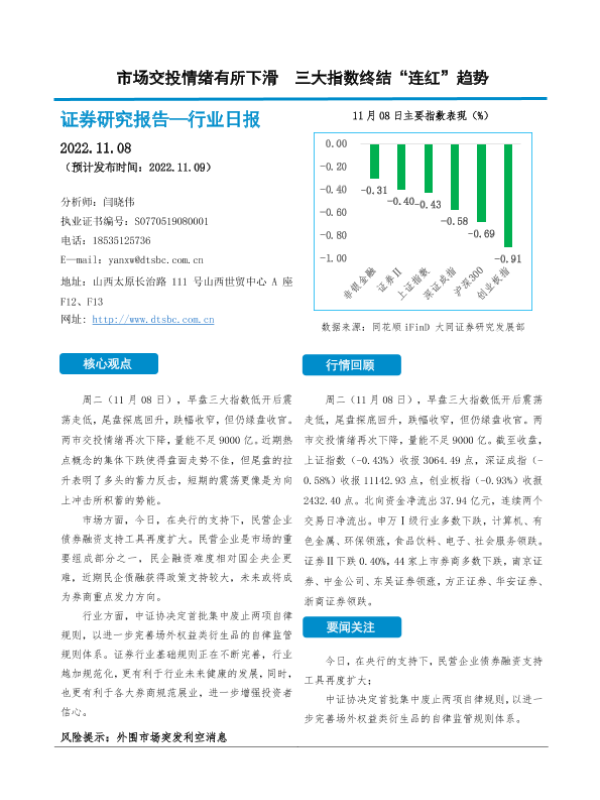 【大同证券】【20221108】市场交投情绪有所下滑 三大指数终结“连红”趋势-10页