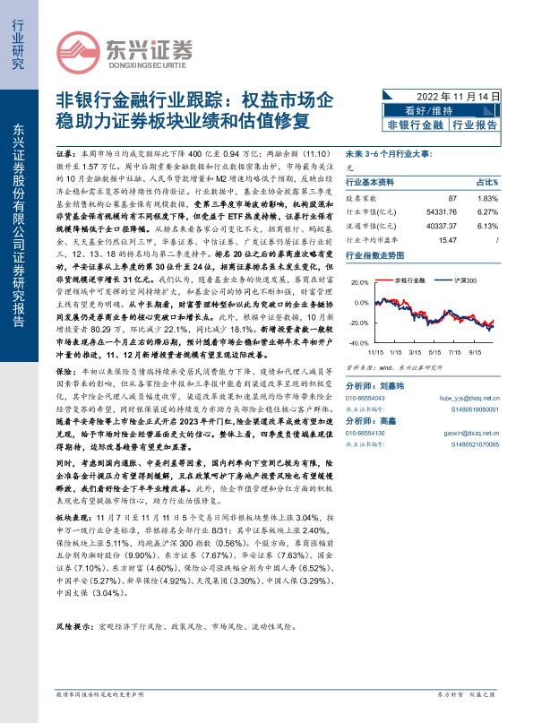 【东兴证券】【20221114】非银行金融行业跟踪:权益市场企稳助力证券板块业绩和估值修复-11页