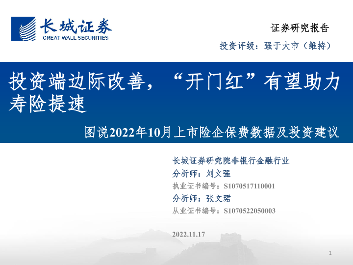 【长城证券】【20221117】图说2022年10月上市险企保费数据及投资建议:投资端边际改善,“开门红”有望助力寿险提速-27页