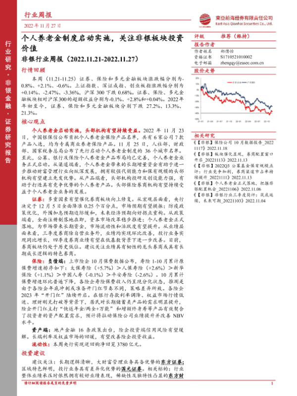 【东亚前海证券】【20221127】非银行业周报:个人养老金制度启动实施,关注非银板块投资价值-10页