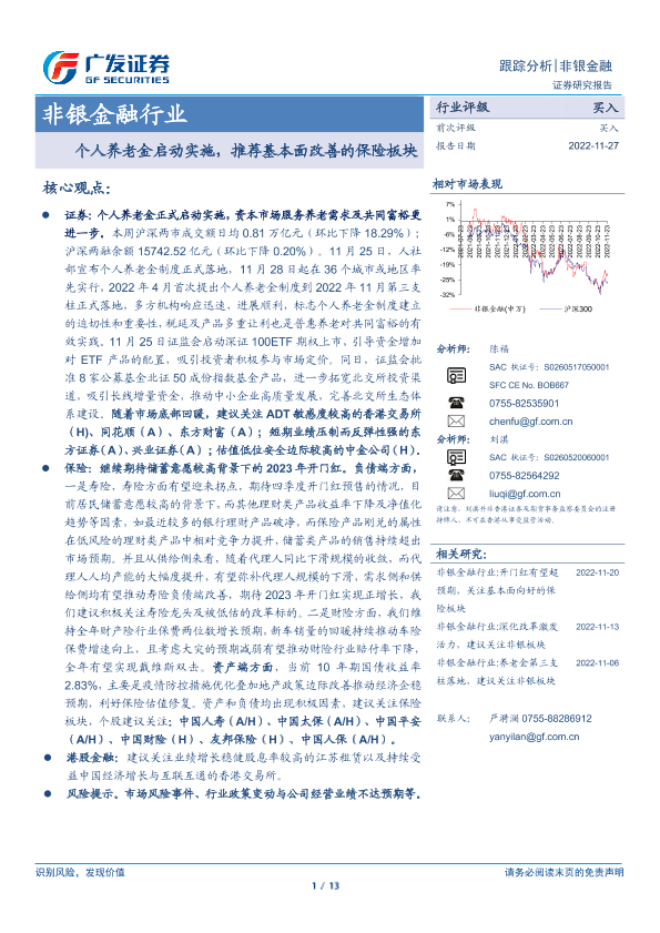 【广发证券】【20221127】非银金融行业跟踪分析:个人养老金启动实施,推荐基本面改善的保险板块-13页