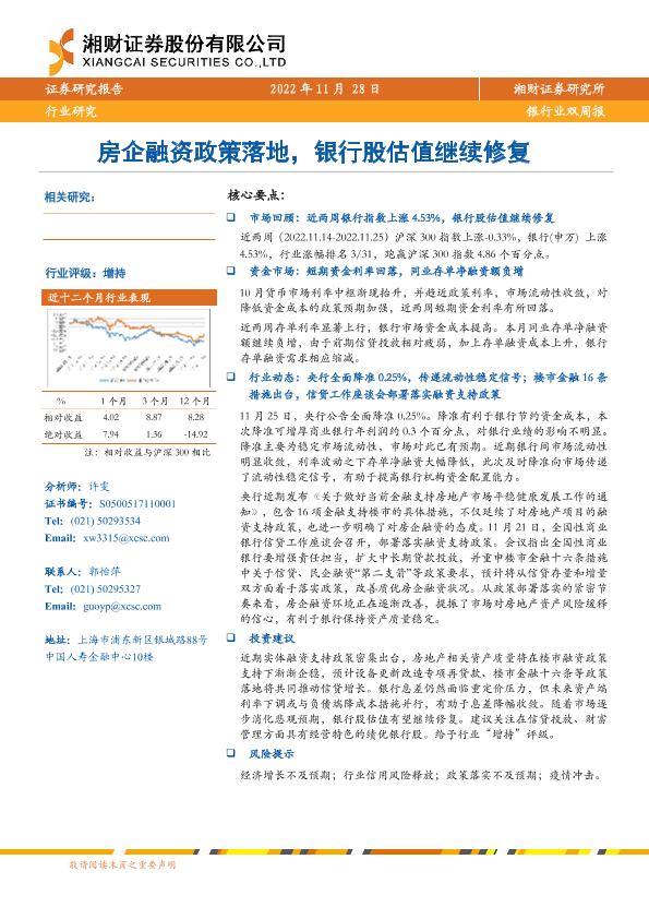 【湘财证券】【20221128】银行业双周报:房企融资政策落地,银行股估值继续修复-10页