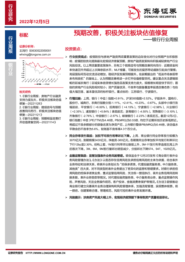 【东海证券】【20221205】银行行业周报:预期改善,积极关注板块估值修复-11页