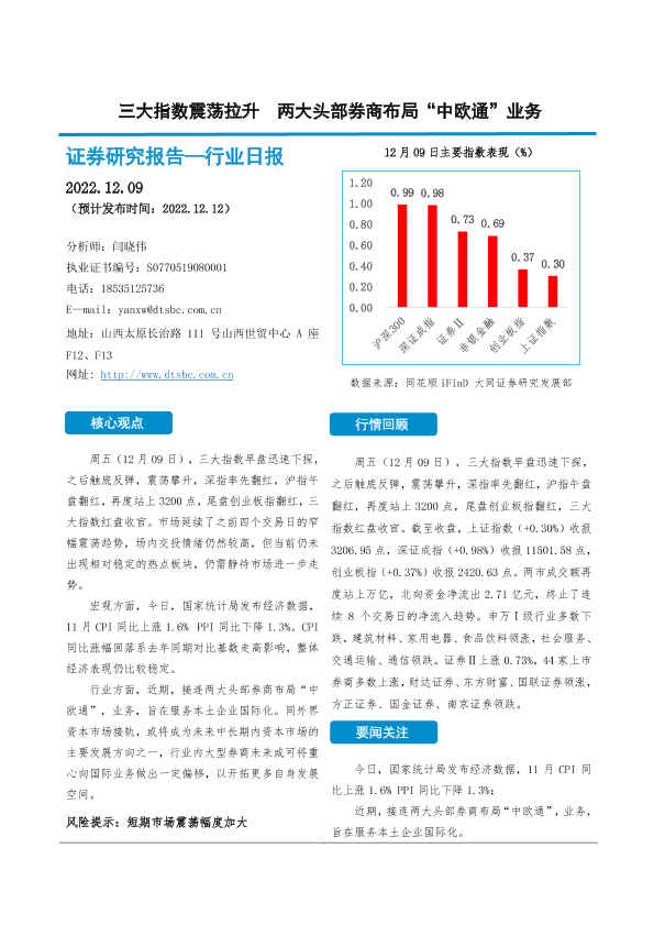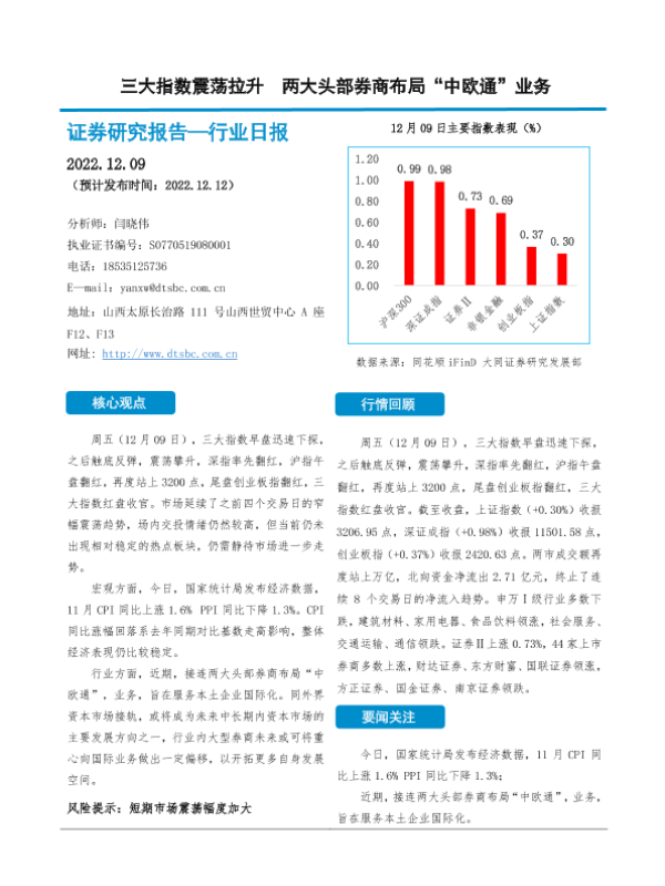 【大同证券】【20221209】三大指数震荡拉升 两大头部券商布局“中欧通”业务-10页