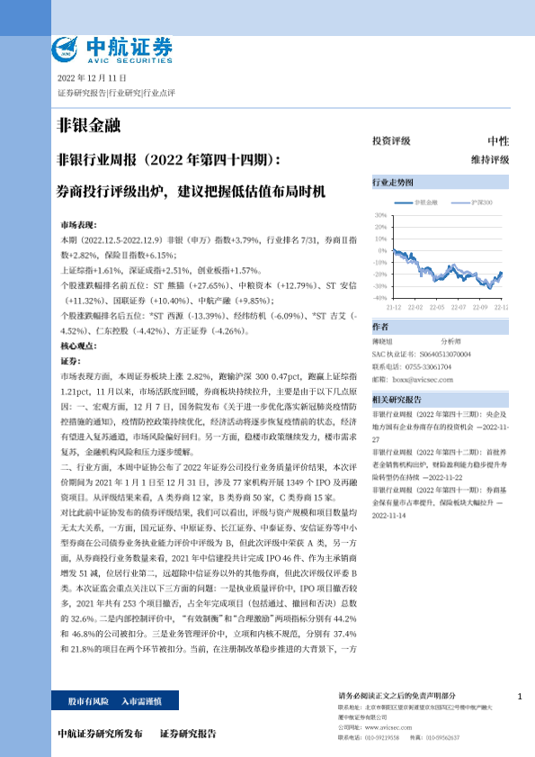 【中航证券】【20221211】非银行业周报:券商投行评级出炉,建议把握低估值布局时机-12页