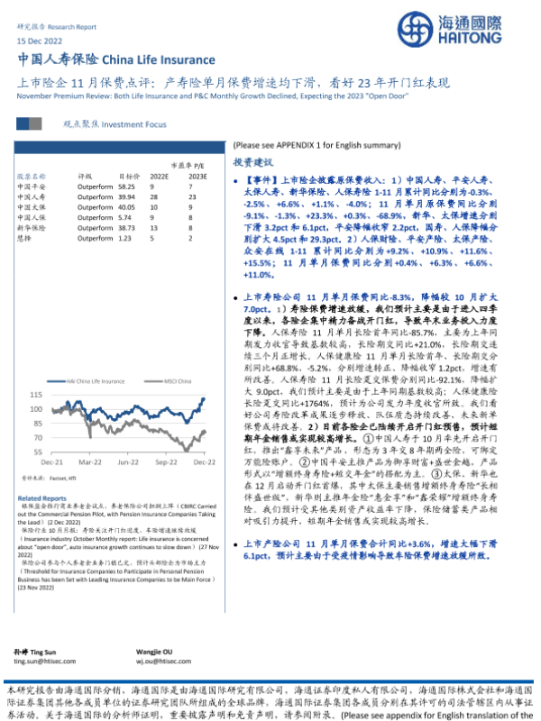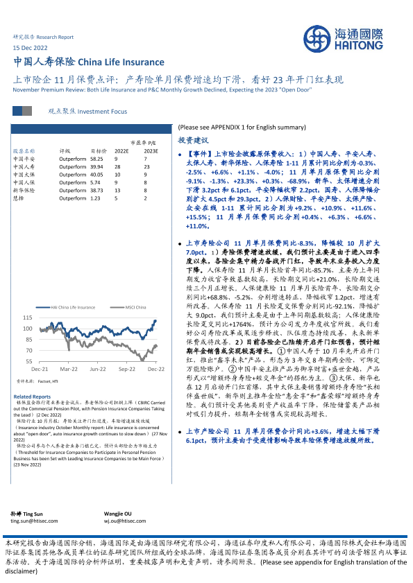 【海通国际】【20221215】上市险企11月保费点评:产寿险单月保费增速均下滑,看好23年开门红表现-13页