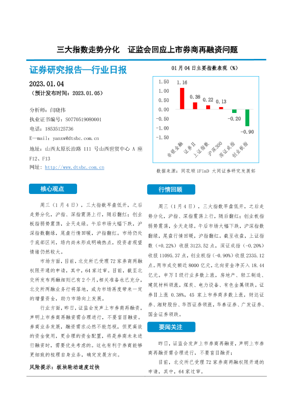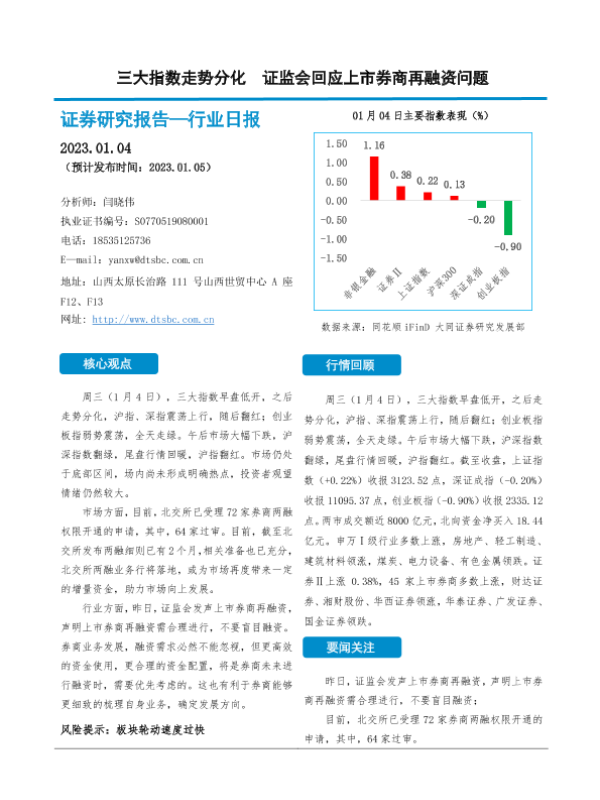 【大同证券】【20230104】非银金融行业日报:三大指数走势分化 证监会回应上市券商再融资问题-10页