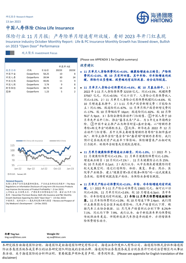 【海通国际】【20230113】保险行业11月月报:产寿险单月增速有所放缓,看好2023年开门红表现-13页