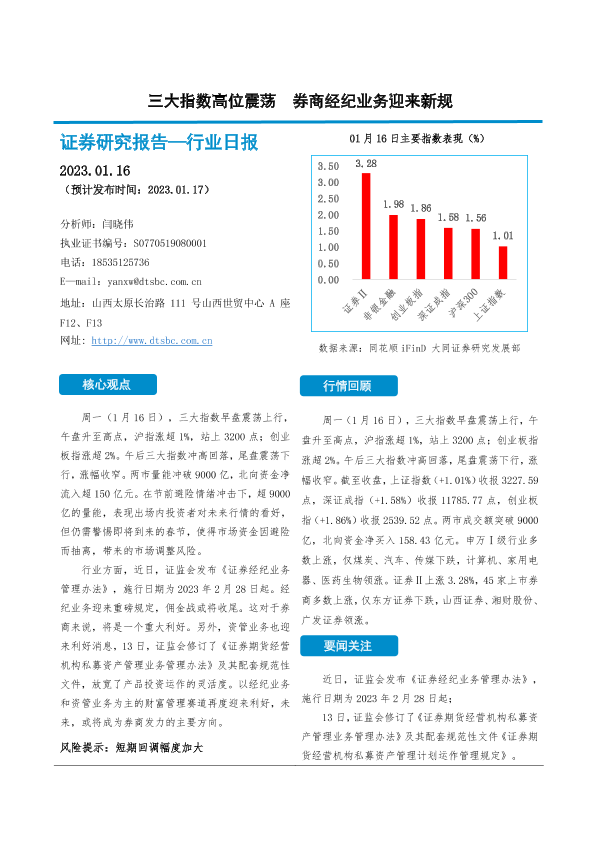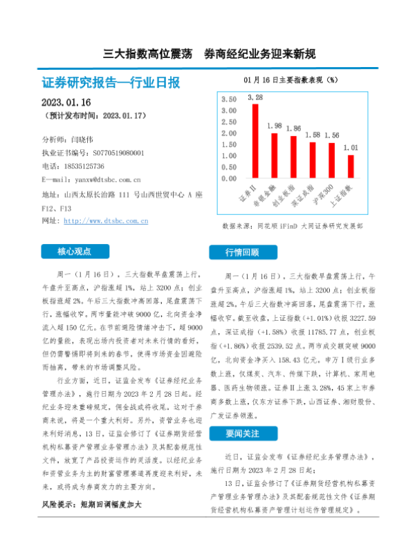 【大同证券】【20230116】非银金融行业日报:三大指数高位震荡 券商经纪业务迎来新规-10页