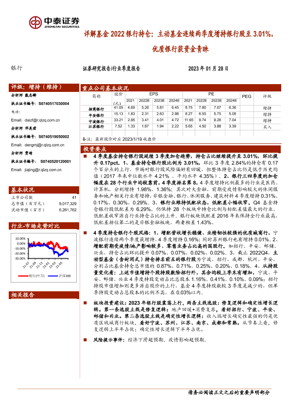 【中泰证券】【20230128】详解基金2022银行持仓:主动基金连续两季度增持银行股至3.01%,优质银行获资金青睐-10页