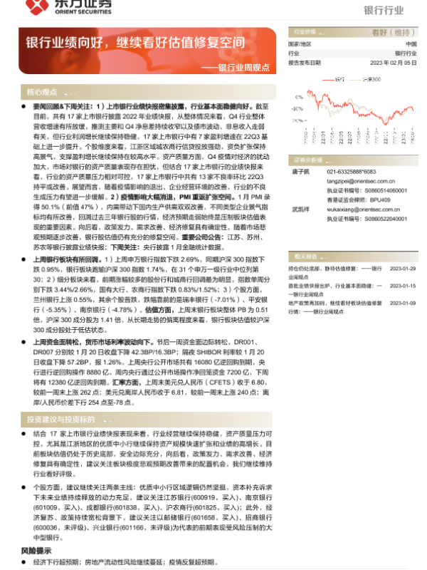 【东方证券】【20230205】银行业周观点:银行业绩向好,继续看好估值修复空间-13页