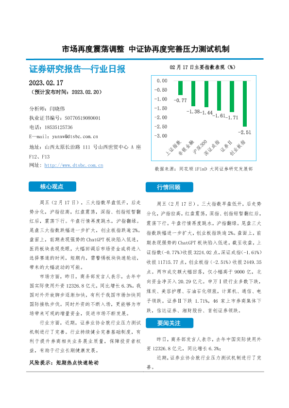【大同证券】【20230217】非银金融行业日报:市场再度震荡调整 中证协再度完善压力测试机制-10页