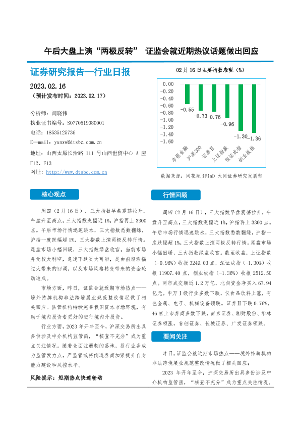 【大同证券】【20230216】午后大盘上演“两极反转” 证监会就近期热议话题做出回应-10页